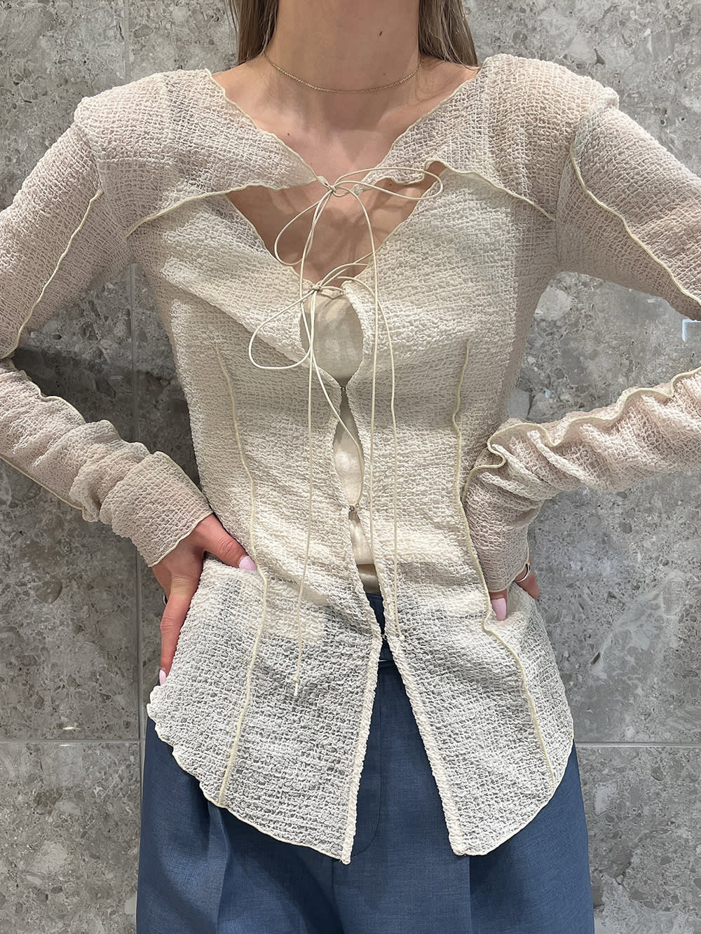 女性らしいトップスはメンズ感のあるパンツでバランス良く仕上げました。